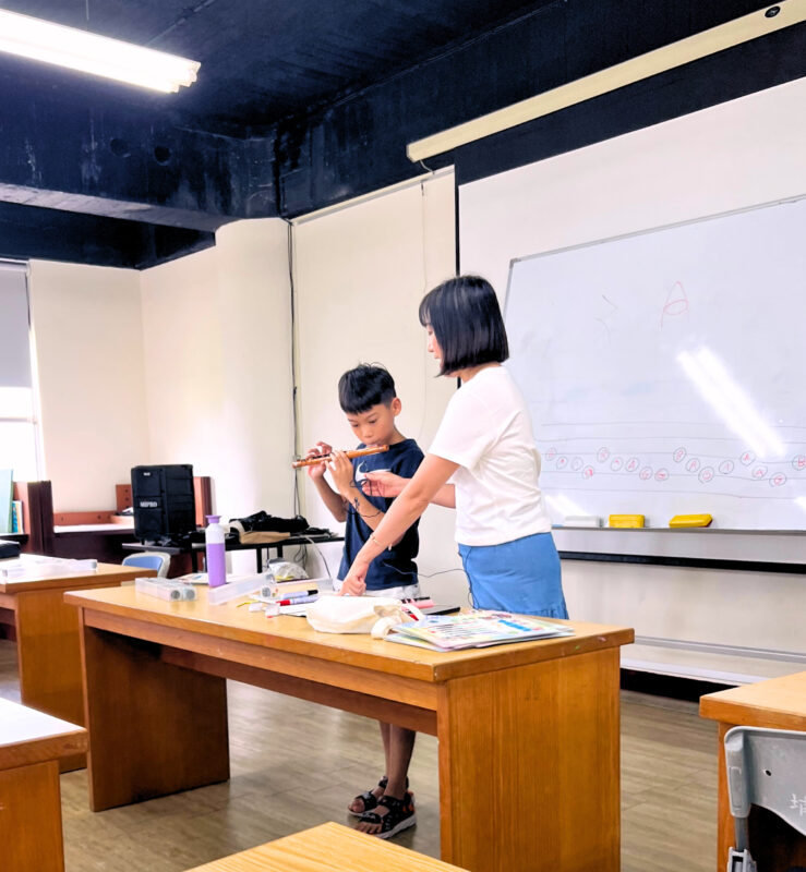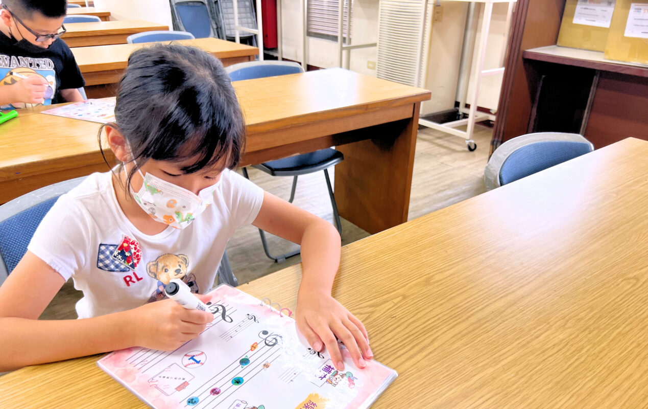 每次上課前,謝志偉總會吹奏一段響笛,帶領孩子們認識響笛音色,讓孩子們身歷音樂國度,體會音樂之美。教學經驗豐富的廖瑋娸也帶著自己設計的音樂講義,講義上沒有冗長的文字,取而代之的是一張張可愛的圖案,讓孩子能用輕鬆歡樂的心情認識音樂。音樂是一個抽象的概念,但廖瑋娸總能透過紙筆與談吐,讓音樂活靈活現地展現在孩子們的眼前,引領孩子們用五官去認識音樂,知識不再只是紙上談兵,而是生活體驗。