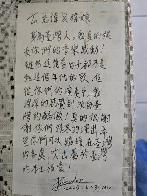 演奏當下!我確實有看到這位來賓,認真的在台下書寫,初期不以為意,但後來接到紙條,與他親自的道謝,我們透過音樂,讓彼此留下美好的一刻!
