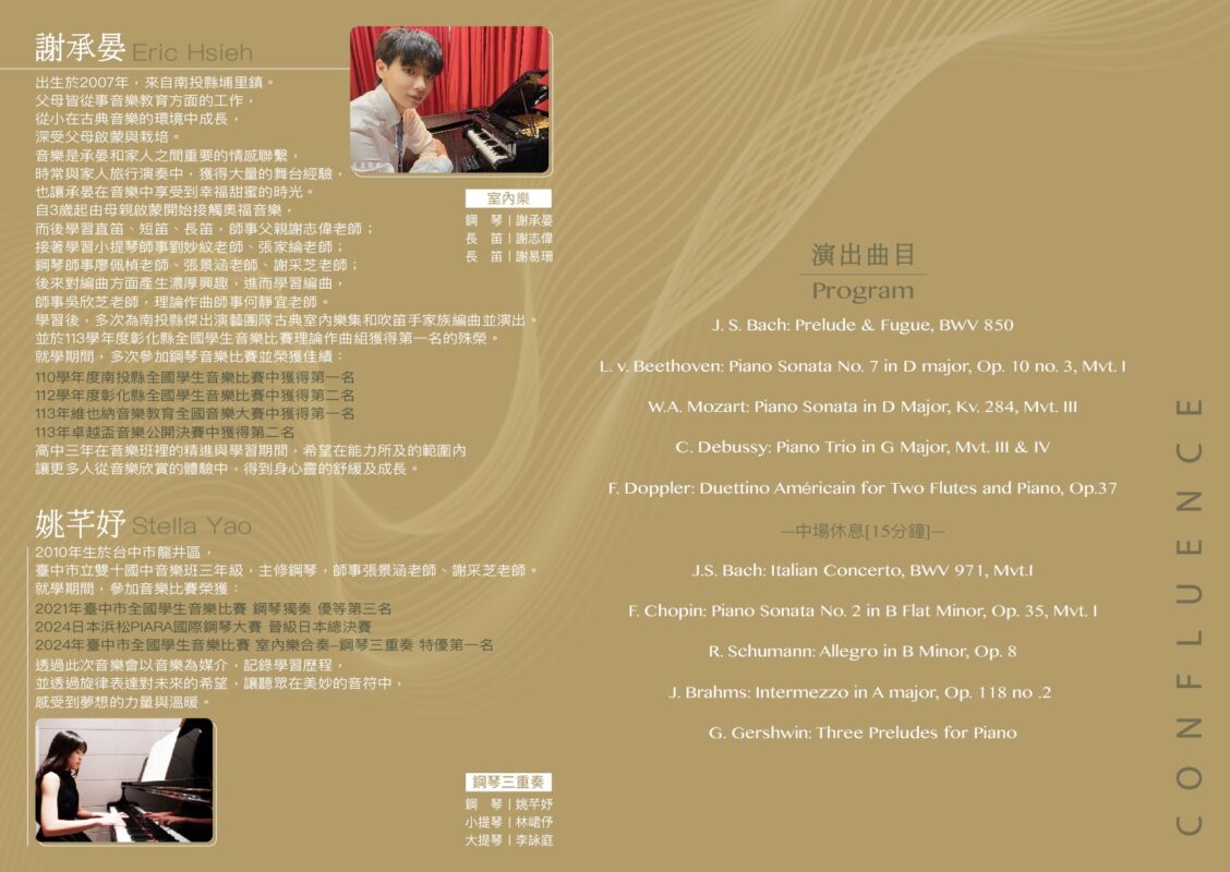 來自南投與台中的兩位青年音樂家—— 謝承晏 與 姚芊妤 ,將在此次東海大學聯合音樂會中展現他們在音樂上的天賦與努力。他們透過鋼琴、室內樂與長笛等多樣化的曲目,為觀眾呈現一場多層次的音樂饗宴。