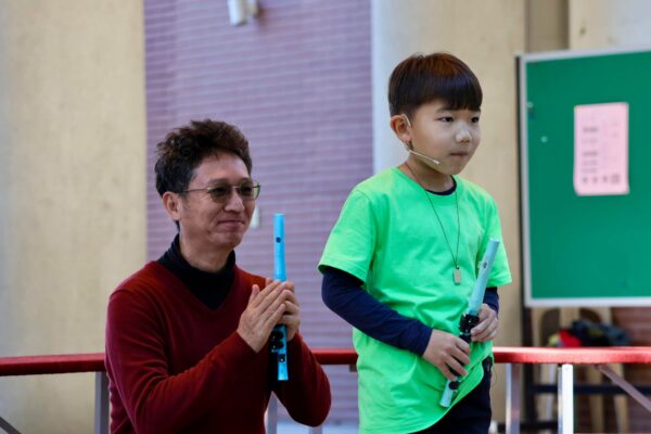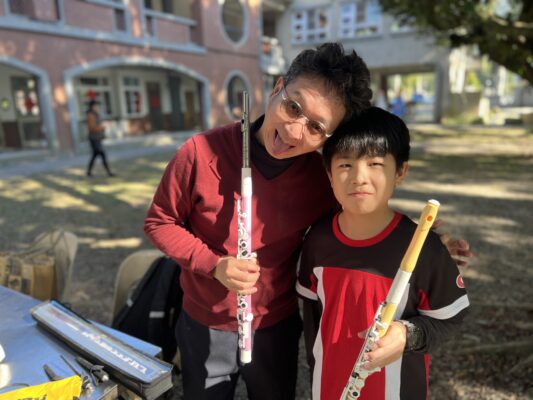 長笛獨奏大挑戰,要一個人面對全校師長獨奏,對吹笛手是一大挑戰,還記得許多場合看到學子拿著長笛登台比賽,一種孤單寂寞,覺得冷(現場冷氣都很冷的狀態)是吹笛手想要突破的,那就從二重奏開始,每一首長笛音樂,其實都可以變成二重奏,三重奏,甚至長笛樂團,於是我們盡可能地與孩子一起二重奏,來減輕孩子單獨面對聽眾的壓力,不過這次不同了~ 先讓孩子獨奏,然後吹笛手再加入,長笛獨奏,然後學生更換響笛,老師長笛低音加入,一起合奏第二段,第三段,吹笛手改換響笛加入,學生需要更換長笛高音,讓一首音樂使用兩種不同樂器演奏,感受增加了樂趣,也降低了演奏的壓力,有吹笛手在身旁 Stand By Me 一起面對校園大舞台!