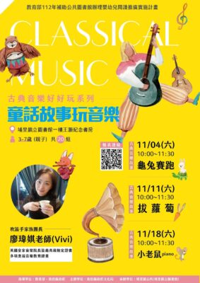 古典室內樂集,Vivi老師 曾受邀至苗栗店仔藝術節,將童話故事,結合古典音樂元素,在遊戲間同時注入著名的古典音樂,搭配吹笛手現場演奏,古典音樂也就開心地融入孩子與家長的共同回憶。