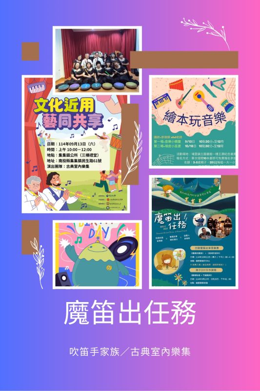 吹笛手家族,於九月13日,星期六當天,將舉辦五場次的藝術活動,在三個不同地區展演。活動內容包含了音樂,藝術,親 […]