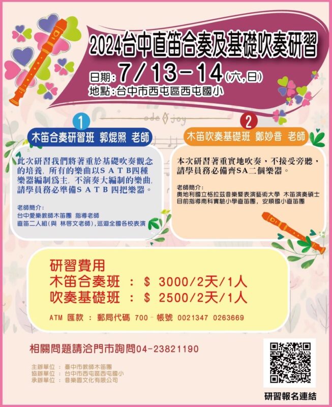 2024台中直笛合奏及基礎吹奏研習 臺中市教師木笛團 主辦 地點 : 台中市西屯區西屯國小 日期 : 7月 […]